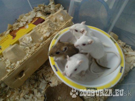 Popis: Hľadám nový domov pre skoro 3-mesačné mláďatká pieskomila mongolského. Mláďatká sú spoločenské a na seba zvyknuté, preto je odber možný len po 2 kusoch. Pohlavie je už zreteľne rozoznateľné, mám samčekov aj samičky bielej a hnedej farby. Len do dobrých starostlivých rúk, nie ako potrava. Dovoz mimo Bratislavy možný. Zadarmo.