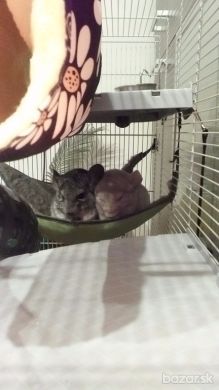 Popis: Ponúkam na predaj 2 samčekov činčily. Tmavší je farby standard grey. Narodil sa 18.5.2016. Je hravý, prítulný, nekúše. Bledší je farby beige. Narodil sa 5.8.2016. Je pokojnej povahy, nekúše. Menším nedostatkom sú zväčšené pršteky na pravej zadnej nôžke, nakoľko si ju ako mláďa poranil. V jeho hravosti, či skákaní ho to však nijak neovplyvňuje. Obaja sú zvyknutí aj na prítomnosť ďalšej činčily v klietke. Predám ich len spolu, nakoľko sú už na seba veľmi naviknutý a spolu sú spokojenší aj viac hraví. Len do dobrých rúk! Predávam z dôvodu sťahovania. Cena: Klietka aj so všetkým príslušenstvom 100€. Činčilky: obidve za 50€. Na cene klietky sa môžme ešte dohodnúť.