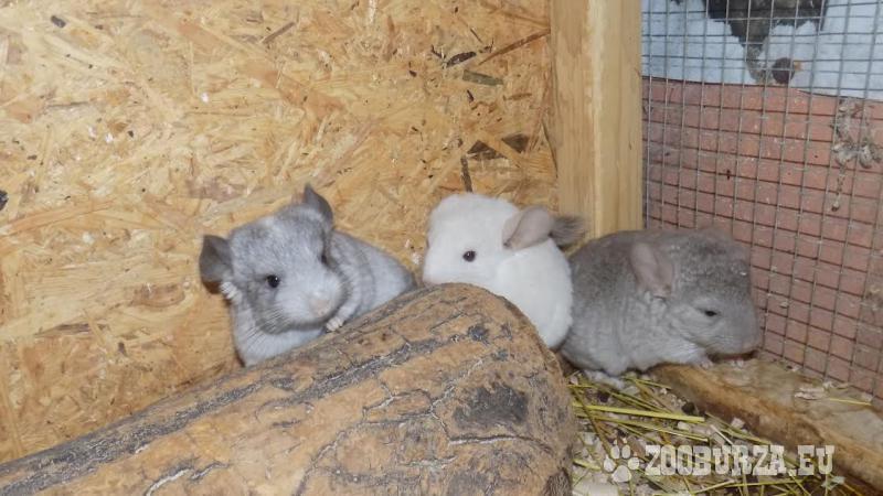 Popis: Predám 2 samčekov činčily- White ebony (biely so sivými a čiernymi fľakmi) za 35€ a samčeka White TAN (celobiely so smotanovým nádychom) za 40€.
