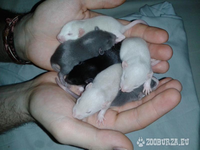 Popis: Darujeme dobrým ľuďom potkanky - 3-mesačné ochočené: 2 samčekovia (čierny bezsrstý, čierny štandard bergshire) a 3 samičky (bezsrstá bez znakov, šedo-biela štandard blazed, biela bez znakov) a predáme aj malé potkanky (narodené 28.3.), samičky - rôzne farby). Všetky sú navyknuté na ľudí, vymazlené, no nemôžeme si ich už nechať.